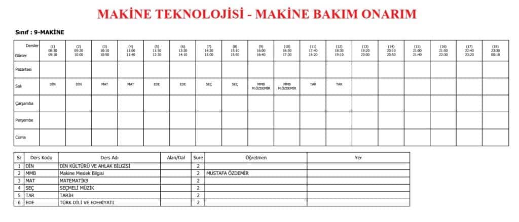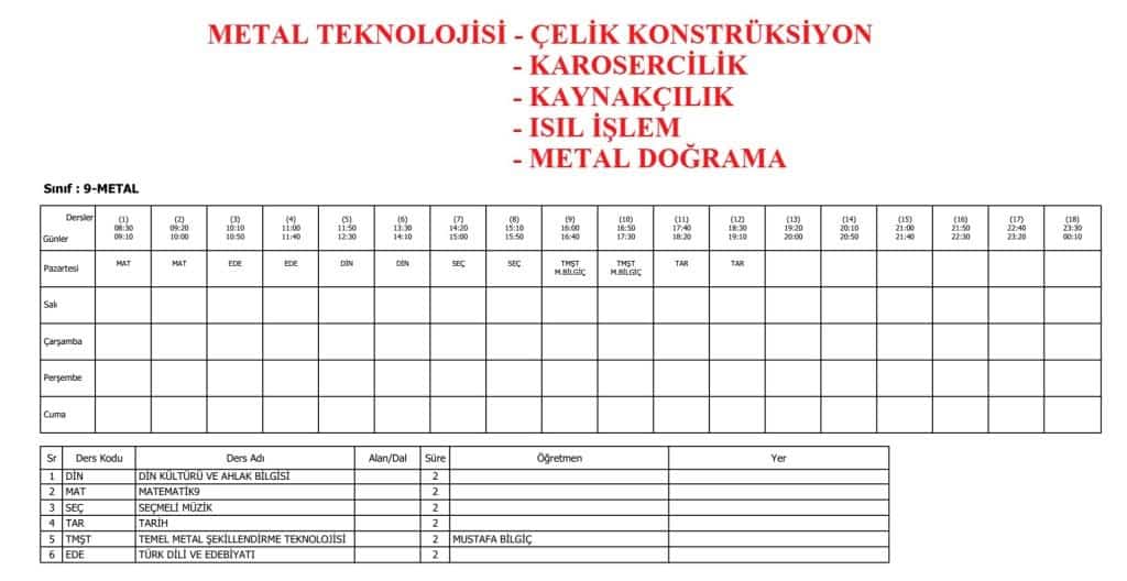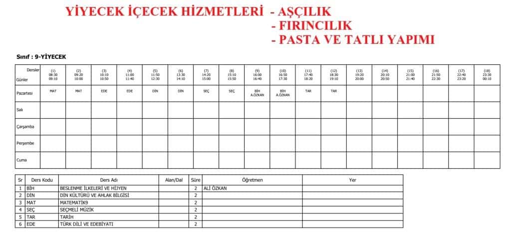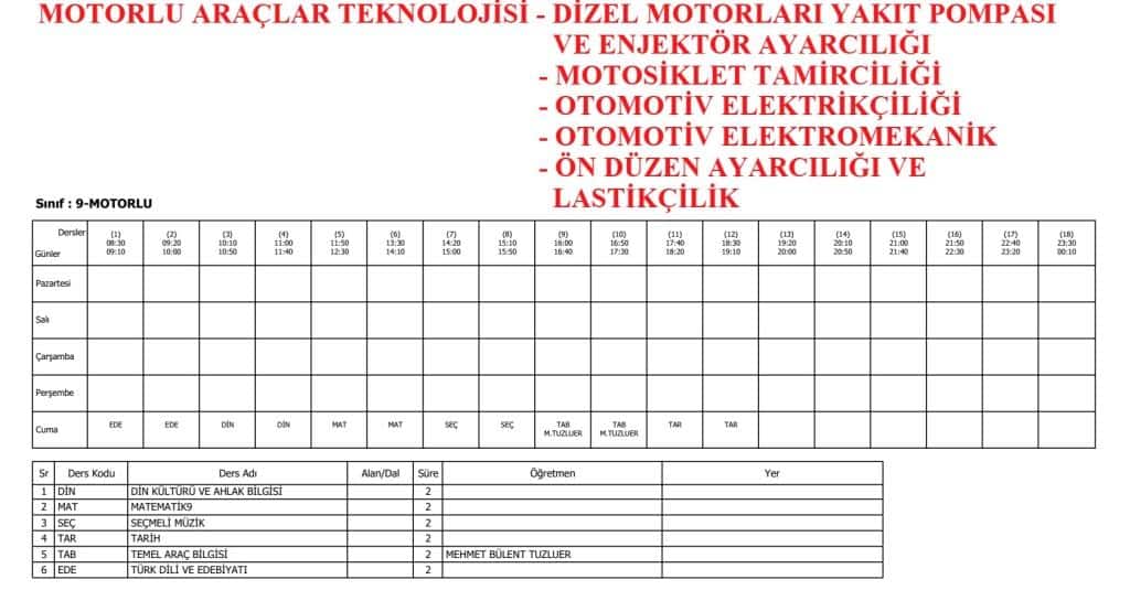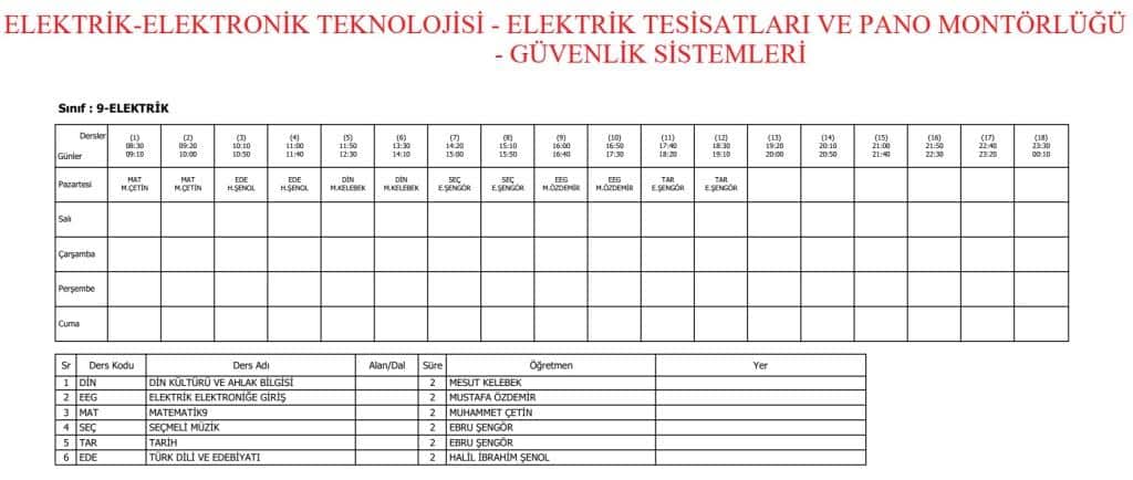 9. SINIFLAR DERS PROGRAMI